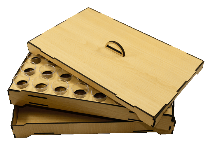Realizadas en fibro plus en una amplia gama de colores, totalmente apilables, con espacio para pan, 40 copitas y tapa.