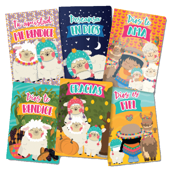 En seis hermosos motivos, con diseños en composé en el frente, dorso e interior, contienen una frase festiva en el frente, un versículo en el interior y espacio para dedicar.